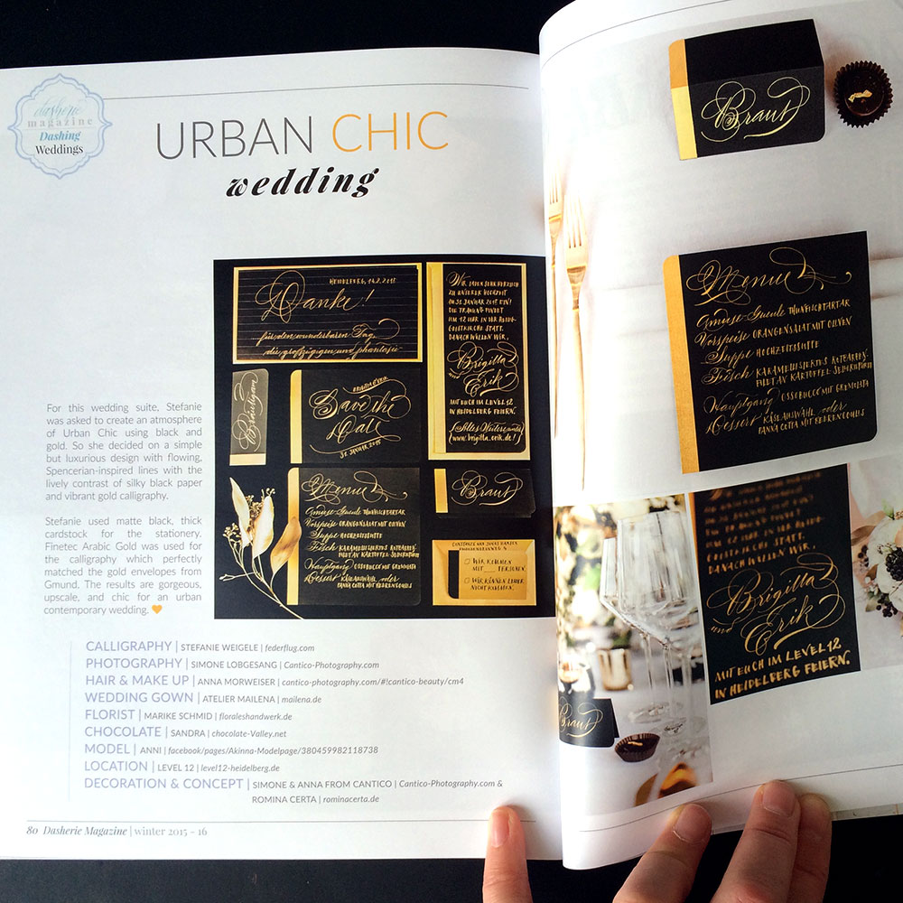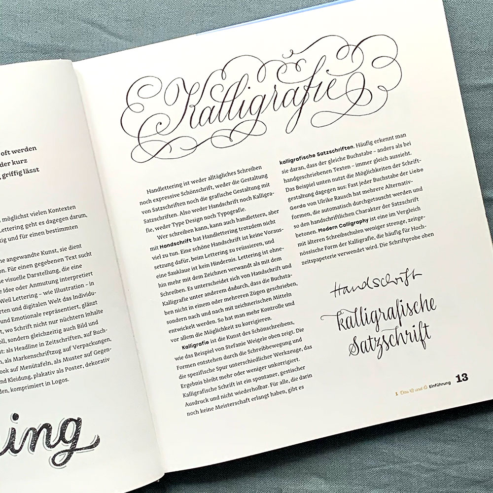 Ms Weigele, as a calligrapher, do you have a favourite letter? :: That’s actually not so easy for me to decide because letters can look very different depending on which script (or font) you use. A lowercase ‘a’ in English cursive has a very distinct shape with seemingly no or very few relation to a lowercase ‘a’ in Fraktur. I find the German ‘sharp ß’ charming because it has something archaic about it. I love trying out different variations of this ligature that work well in Copperplate (or English Roundhand) – because the ‘ß’ doesn’t actually exist in other languages than German.