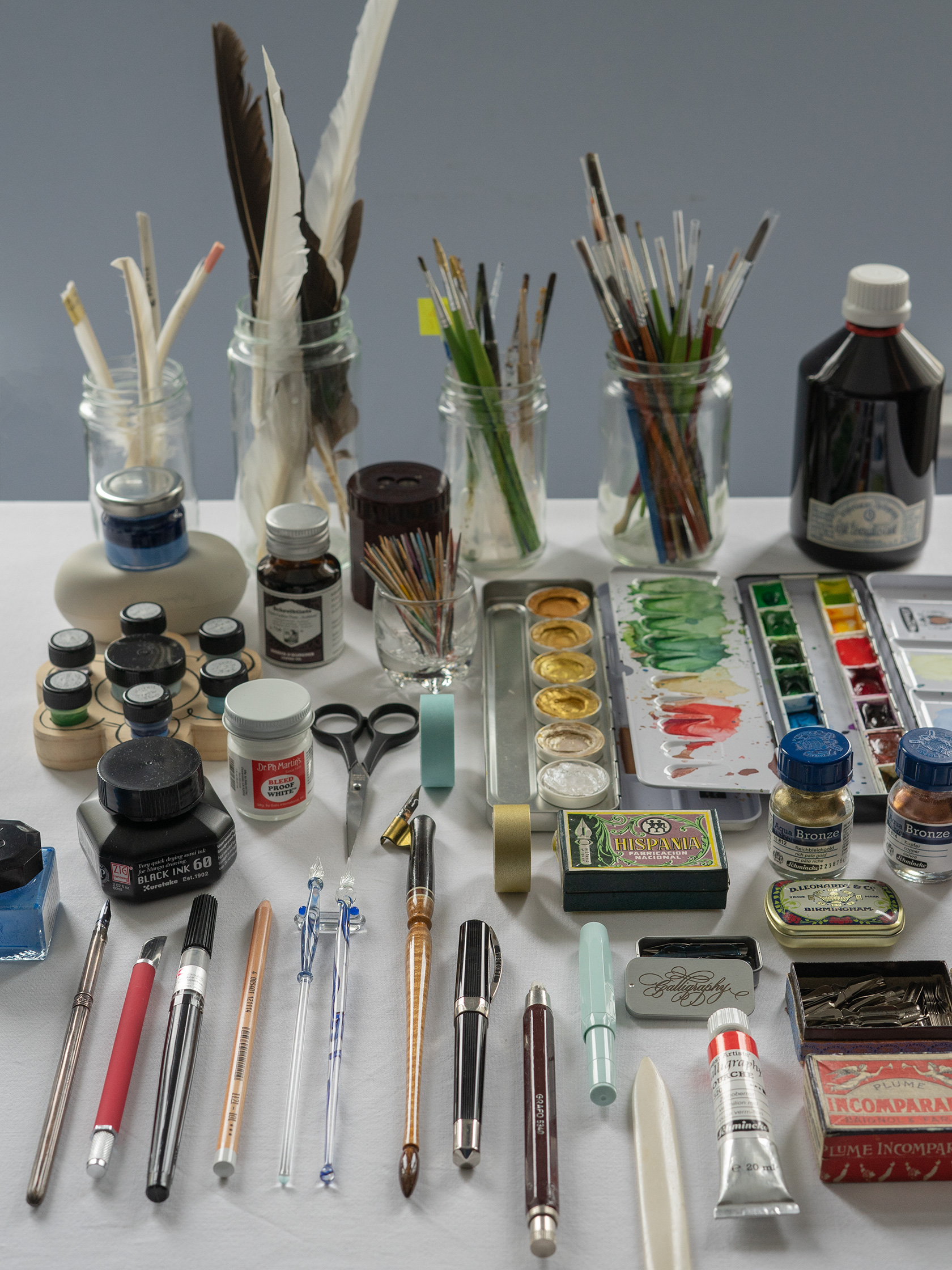 To get started with calligraphy, you only need a fraction of these tools and supplies - see Resources and the section about my Book for more details! © for the photography: Ricarda Kopp for Verlag Hermann Schmidt