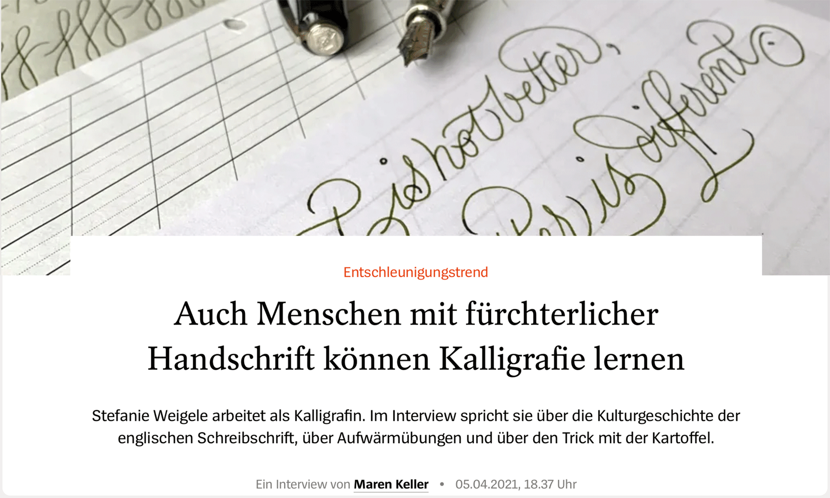 Im Frühjahr 2021 (mitten im zweiten, zähen Jahr der Pandemie) habe ich mich sehr über die Anfrage von Spiegel Online zu einem Interview gefreut! Es ging darin, logisch, vor allem um Kalligrafie und meinen ganz persönlichen Zugang dazu, ein bisschen um Geschichte, Drills, Kartoffeln und mein Buch. Nachlesen lassen sich Fragen und Antworten hier!